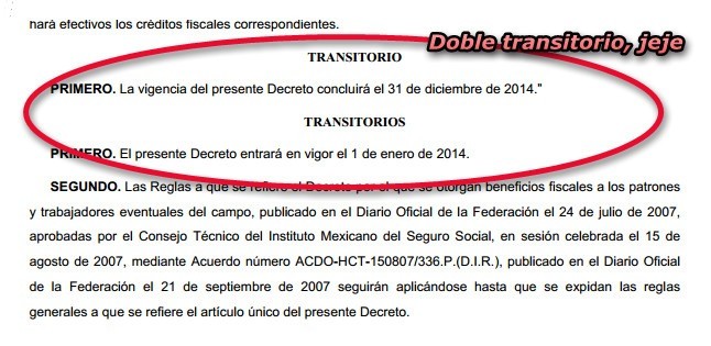 Activos estamos en la ultima semana del año, ya que este lunes 30 diciembre, además de que salió la miscelánea fiscal, también se publica en el Diario Oficial, un decreto de beneficios fiscales en materia de seguridad social, para ños patrones del campo, decreto que tendrá una vigencia del 1 de enero al 31 de diciembre del 2014.