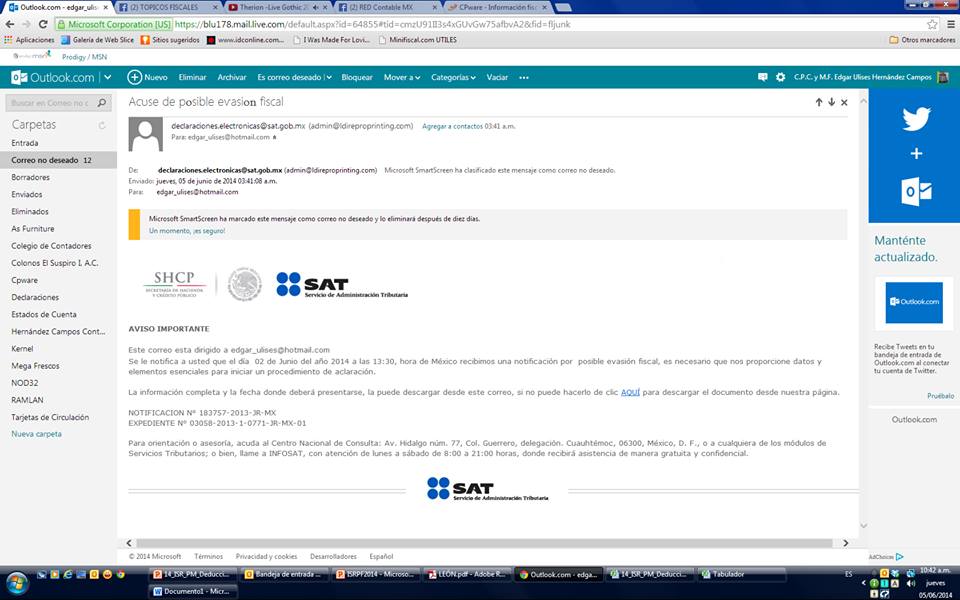 Saludos a todos. Les comparto un correo que me llegó supuestamente del SAT donde se señala que me están investigando por una supuesta evasión fiscal. Lo anterior además de que es falso, es un engaño para extraer datos personales. No se dejen sorprender, ya que sabemos que la obtención de datos es con el fin de utilizarlos para el crimen organizado sobre todo secuestros y extorsiones. Cuidado a todas(os) y espero les sea útil la información.